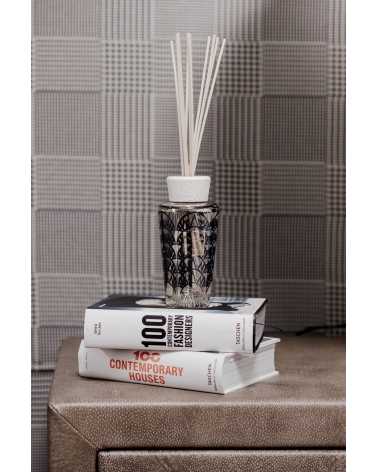 Le diffuseur de parfum d’intérieur Manhattan est un verre au décor sérigraphié de platine et de bleu marine inspiré de l’architecture Art Déco du Chrysler building.