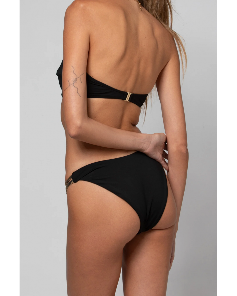 Découvrez le bas Salvia, une pièce élégante et graphique pensée pour allier confort et style. Sa coupe classique est rehaussée par des lanières dorées sur les côtés, apportant un détail structuré et raffiné qui souligne la silhouette avec subtilité.