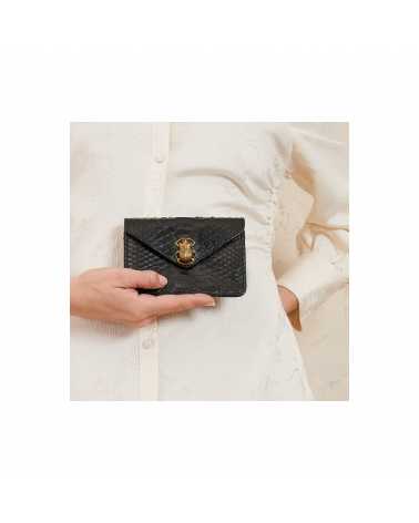 Cette petite pochette en python qui prend la forme d'une enveloppe est ornée d'un fermoir en forme de scarabée en laiton. Parfaite pour garder tous vos petits papiers et votre monnaie grâce à ses différents compartiments, elle se glissera facilement dans tous vos sacs.