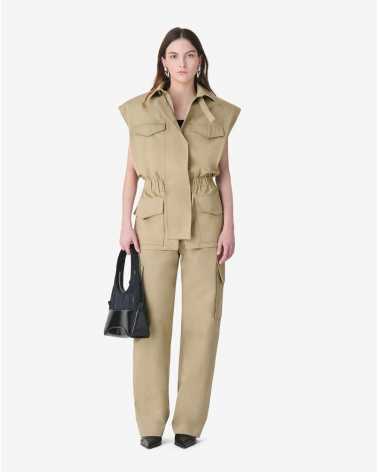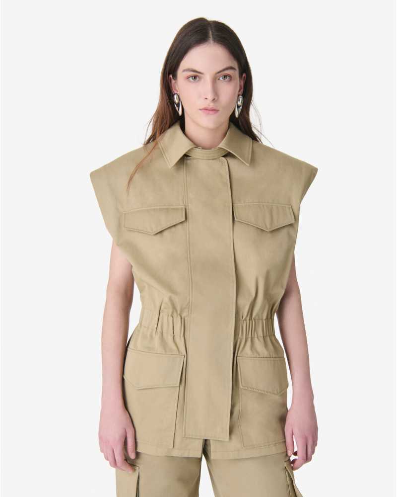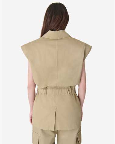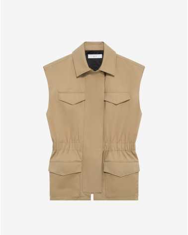 Veste sans manches IZIEL. Col chemise structuré et taille resserrée par un élastique intégré. Fermeture éclair dissimulée et poches plaquées à rabat.