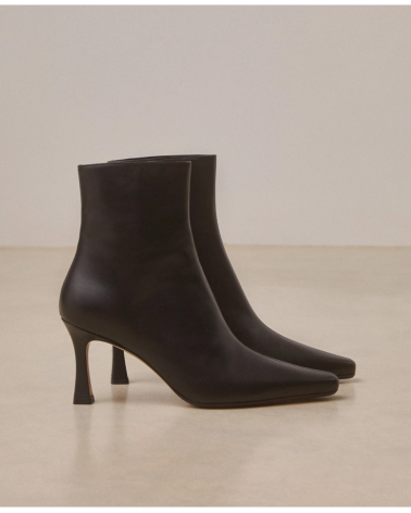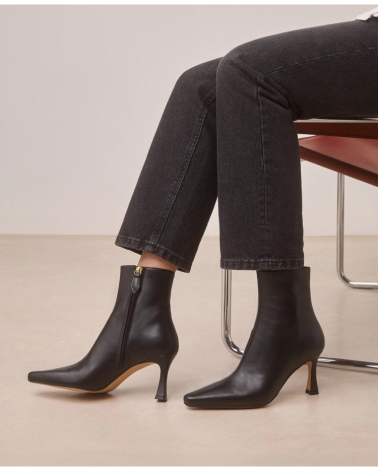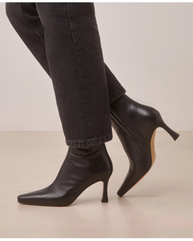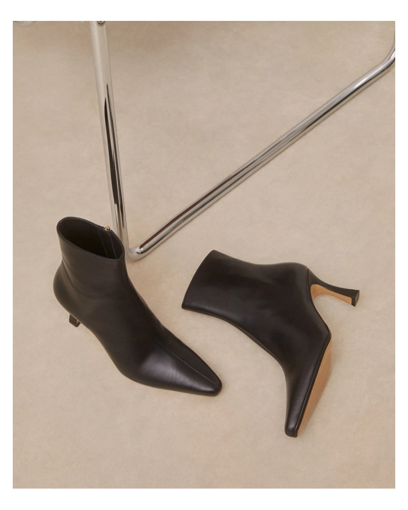 Ces bottines à talon affûté revisitent l’élégance minimaliste avec des détails d’atelier subtils. Leur ligne pure, ponctuée d’un open-stitching délicat à l’avant, évoque un style à la fois contemporain et intemporel. Chaque élément a été pensé pour allier raffinement et confort.